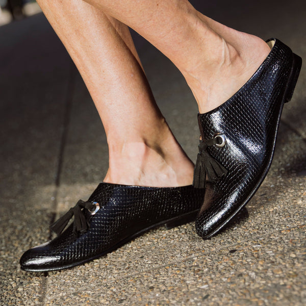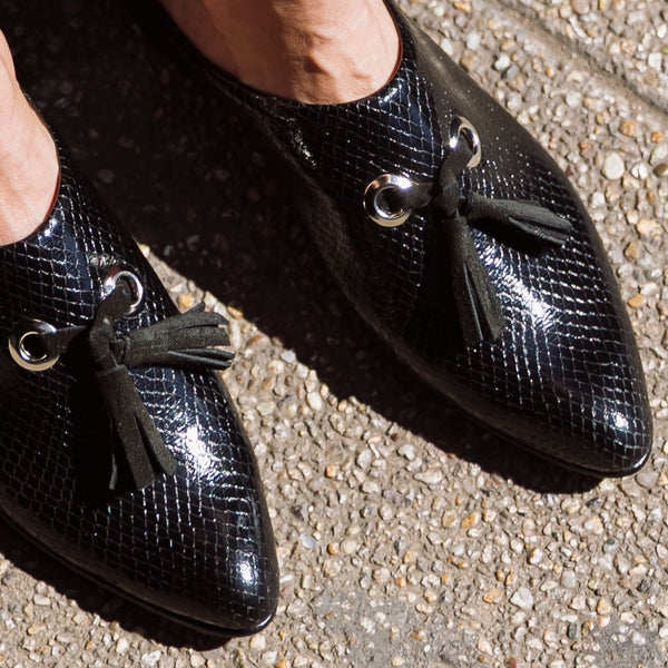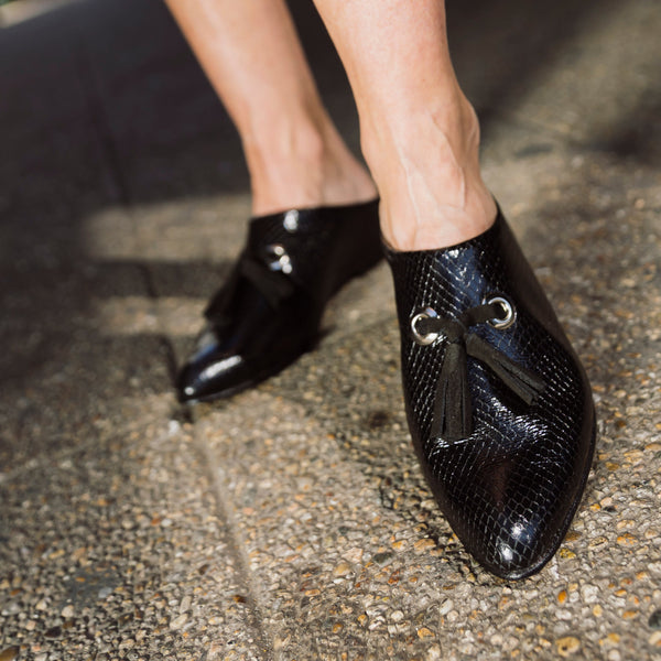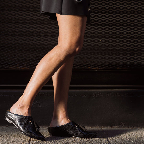 Babucha Noa confeccionado en cuero de vacuno texturado negro, combina un diseño clásico y moderno. Incluye un con taco interno 2cms. Detalle de ojetillos y borlas ad-hoc a un estilo urbano.