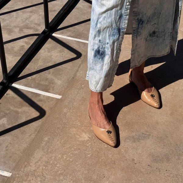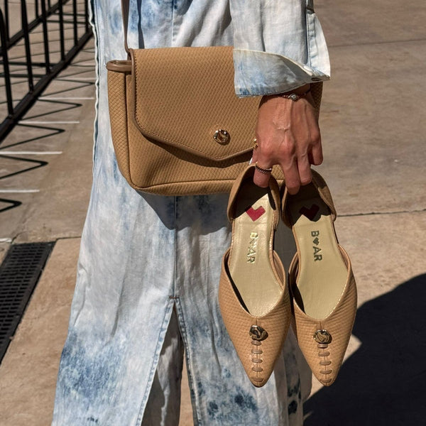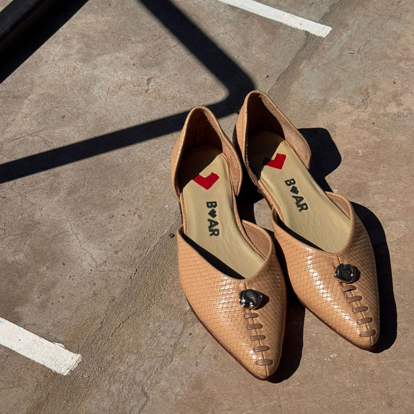 Ballerina Nora en cuero petate camel, con forro color al tono. Aplique metálicos exclusivamente diseñado para BAR.