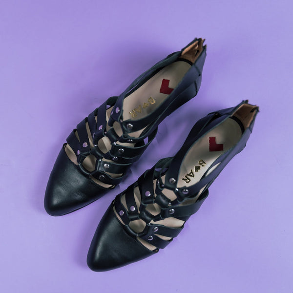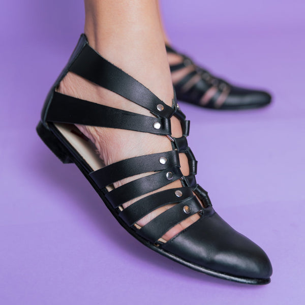 Sandalia Kazumi en napa negra y detalles metalicos con argolla central y cierre posterior.
