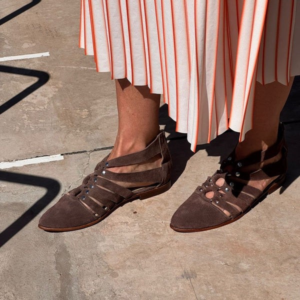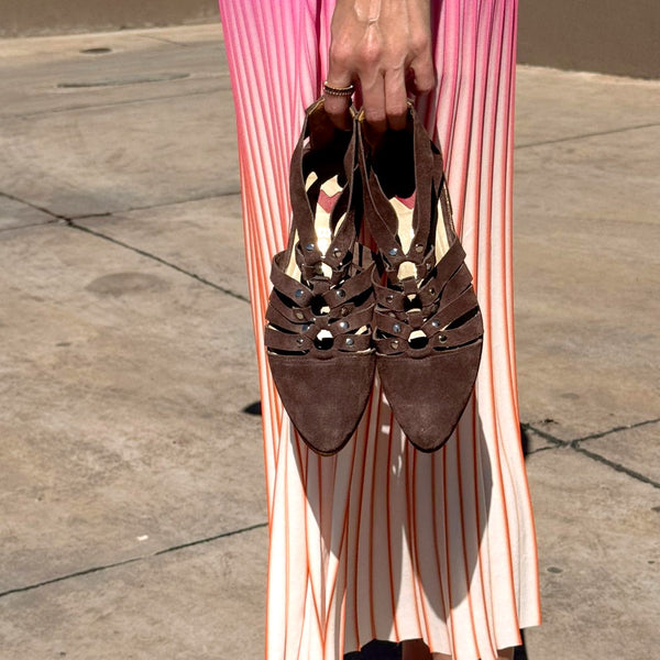 Sandalia Kazumi en reno chocolate y detalles metálicos con argolla central y cierre posterior.