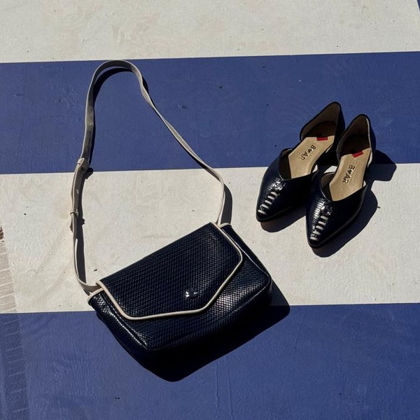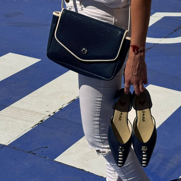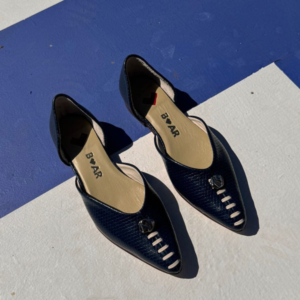 Ballerina Nora en cuero petate azul, con forro color marfil. Aplique metálicos exclusivamente diseñado para BAR.