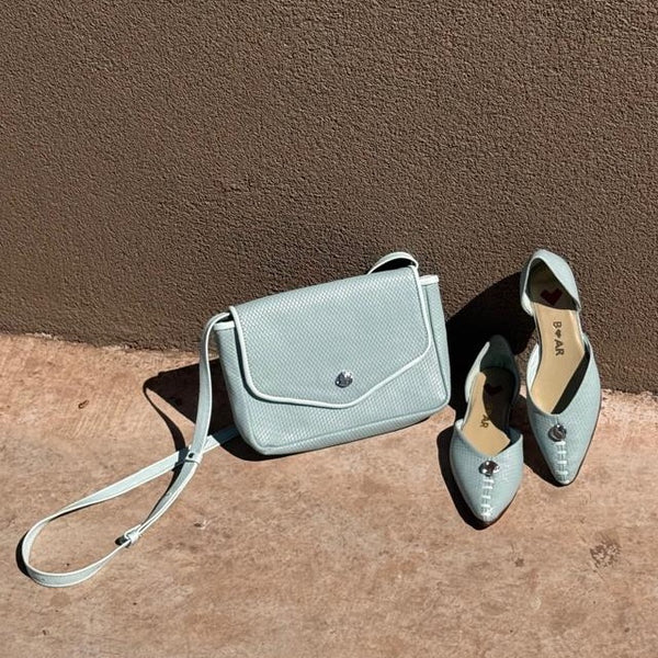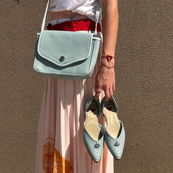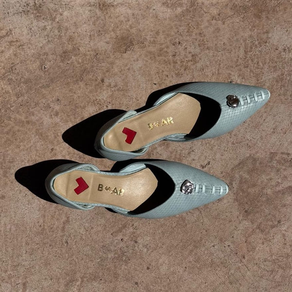 Ballerina Nora en cuero petate celeste, con forro al tono. Aplique metálicos exclusivamente diseñado para BAR.